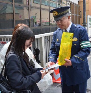 冒頭に山口署長があいさつに立つと、「4月に入り新学期が始まっており、新入学児が登校している。特に子どもたちが事故に遭わないように、皆さんの協力をよろしくお願いします」と話し、キャンペーンがスタート。署員らが駅利用者や通行人に対して、用意した300個の啓発物を手渡し、交通安全を訴えていった。
