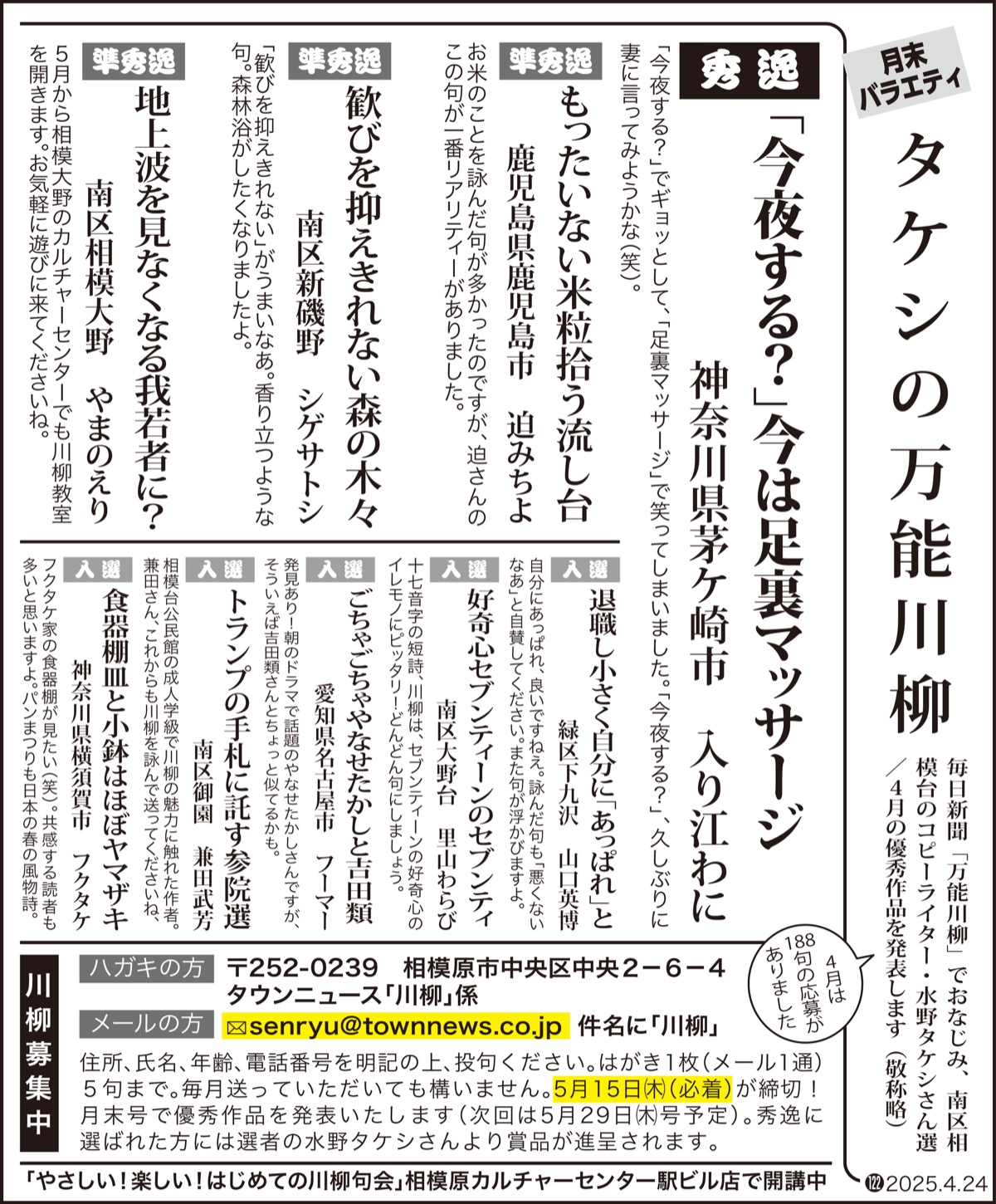 タウンニュース相模原支社では毎月月末号に掲載される「タケシの万能川柳」の川柳を募集しています。投句いただいた作品は毎日新聞「仲畑流万能川柳」などでおなじみの水野タケシさんが選句します。応募方法は左記枠内に。