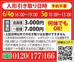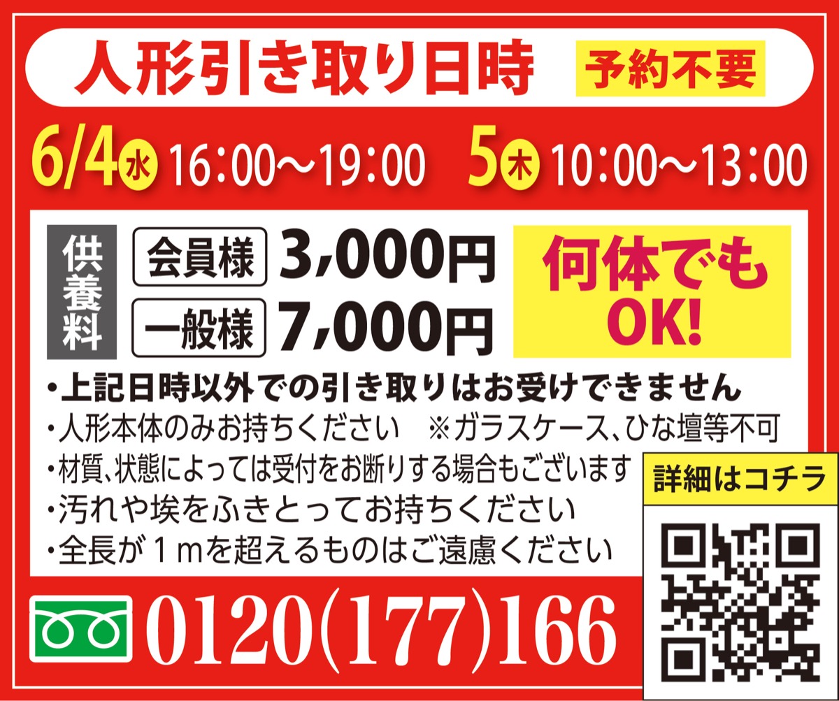 「お預りした人形をご住職に供養していただきます」。法要は5日、13時〜(自由参加・入場無料)。参加者には後日供養報告書を送付。供養料は会員3千円、一般7千円。個数制限はなし。詳細は気軽にお電話を。