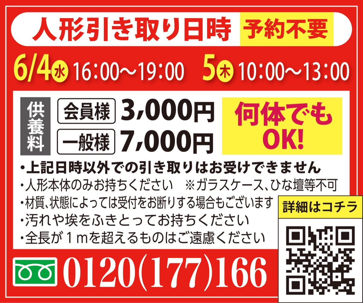 「お預りした人形をご住職に供養していただきます」。法要は5日、13時〜(自由参加・入場無料)。参加者には後日供養報告書を送付。供養料は会員3千円、一般7千円。個数制限はなし。詳細は気軽にお電話を。