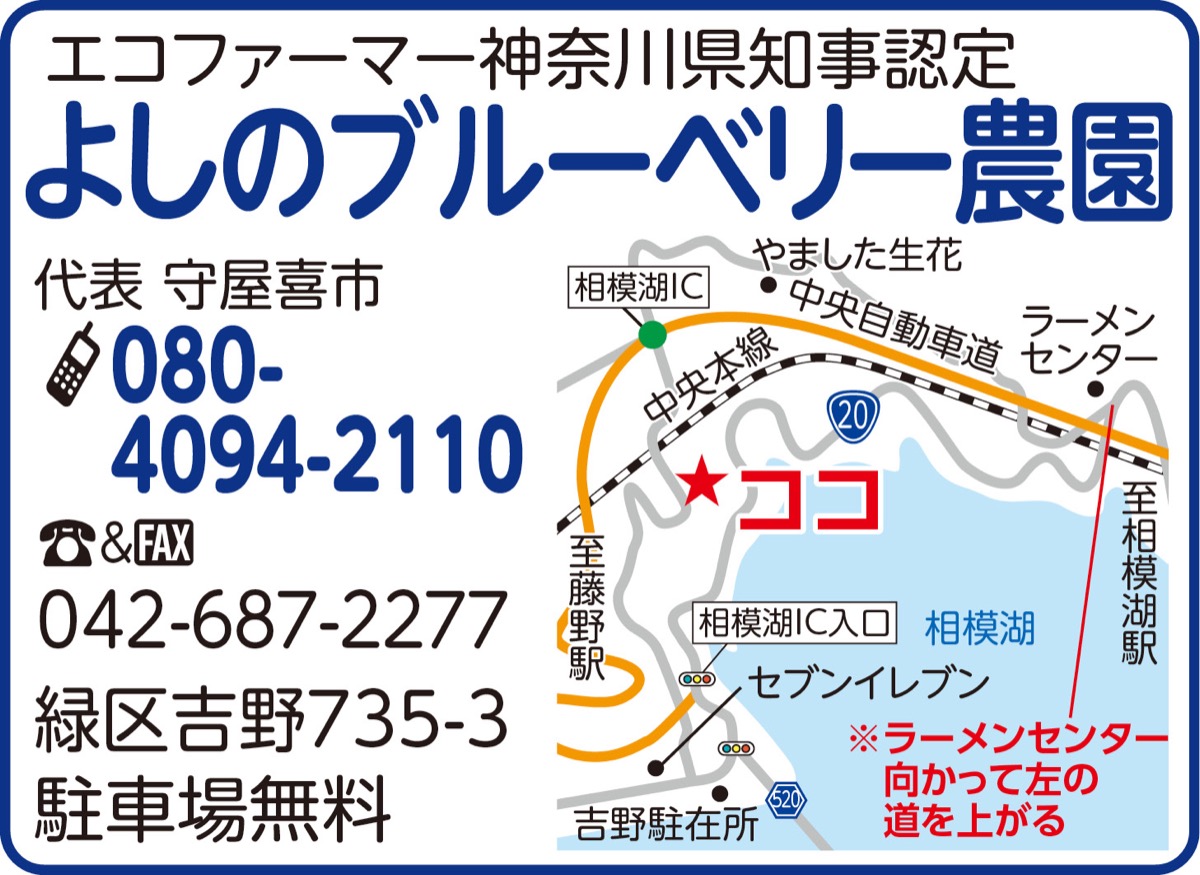 『よしのブルーベリー農園』では、有機栽培で育てた新鮮な完熟ブルーベリーの摘み取りを受付中。相模湖を望む雄大な自然の中で鈴なりの果実を摘み取り、その場で味わえる。「今年も粒が大きくて甘いです」と園長。入園無料、市内外からのリピーター多数。摘み取った実は100g260円で持ち帰れる(500g〜)。開園は午前9時〜午後4時、水曜休(荒天休業)。要事前予約。9月上旬まで開園(実が無くなり次第終了)。