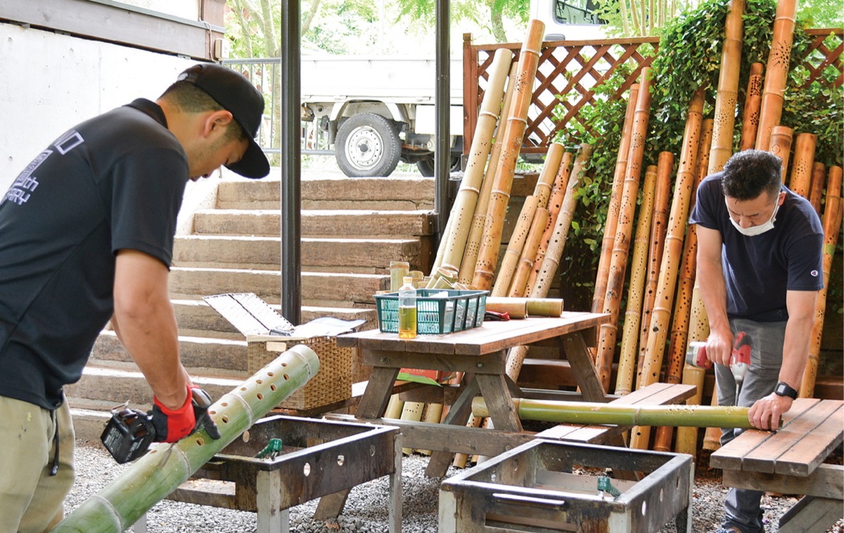放置された竹林が多いと言われる藤野地区。同青年部では竹林を整備するだけでなく、伐採した竹を地域の資源として活かせないかを考え、切り出した竹に穴を開け、優しいあかりを灯すイベントを企画。同青年部50周年特別委員会の山崎勇貴委員長は「地域の課題を希望の火として灯していきたい」と思いを話す。