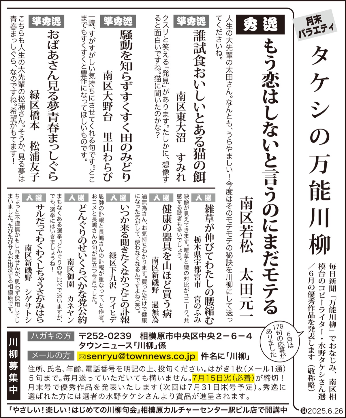 タウンニュース相模原支社では毎月月末号に掲載される「タケシの万能川柳」の川柳を募集しています。投句いただいた作品は毎日新聞「仲畑流万能川柳」などでおなじみの水野タケシさんが選句します。応募方法は右記枠内に。