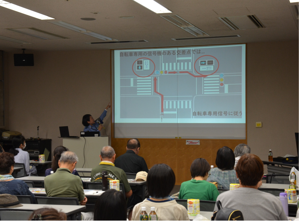 当日は約70人が参加。 神奈川県警の交通安全教育隊の隊員が講師を務め、「一時停止の標識のある場所では停止線の手前で止まる」「夜間はライト点灯」「飲酒運転は禁止」など自転車の乗車ルールをクイズ形式で確認した。
