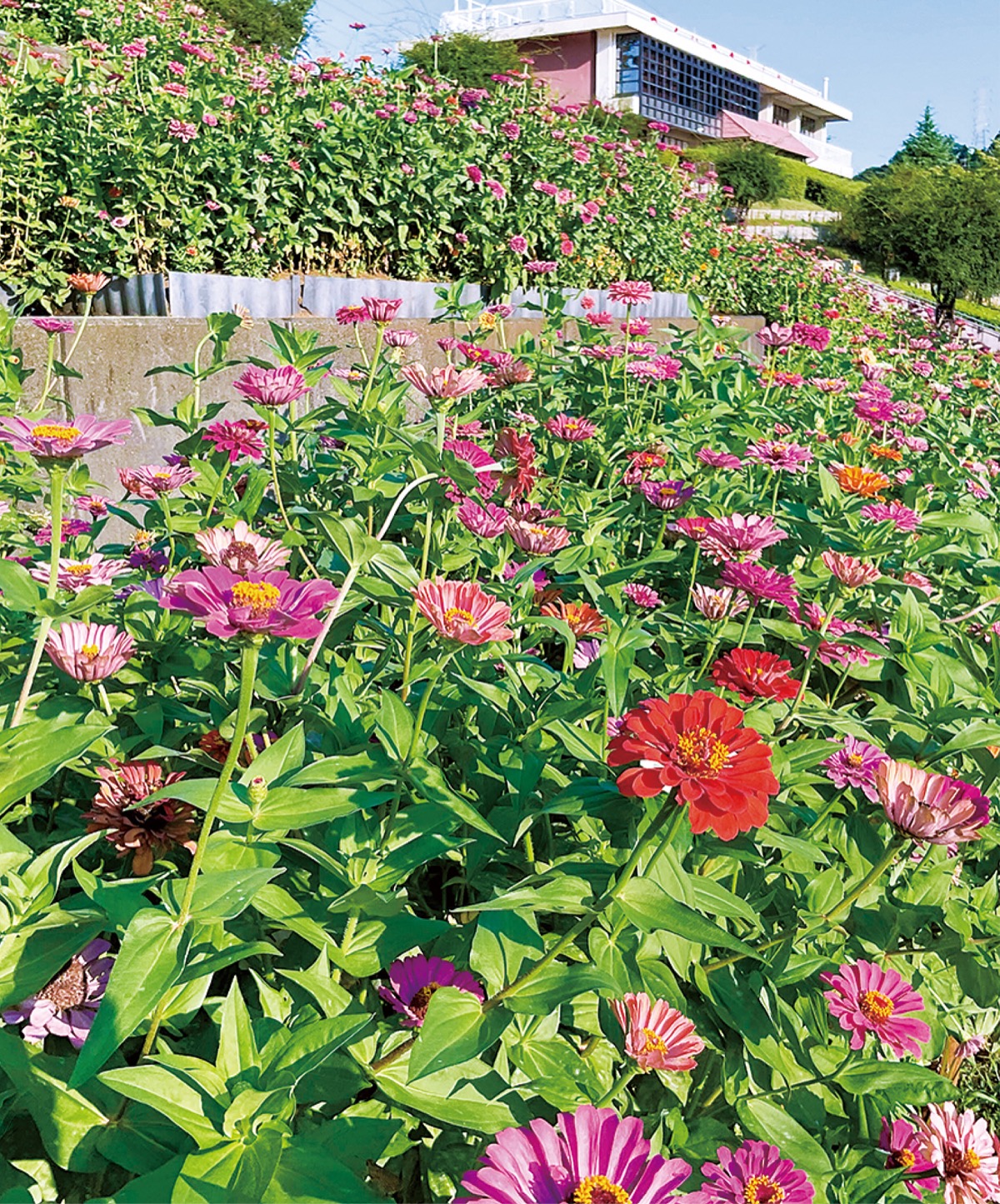 同園のジニアは、草丈が高く花びらの重ねが良いのが特徴。園内には約2万5千株が植えられており、赤、白、ピンク、むらさき、オレンジ、黄色など、色とりどりの花を観賞することができる。