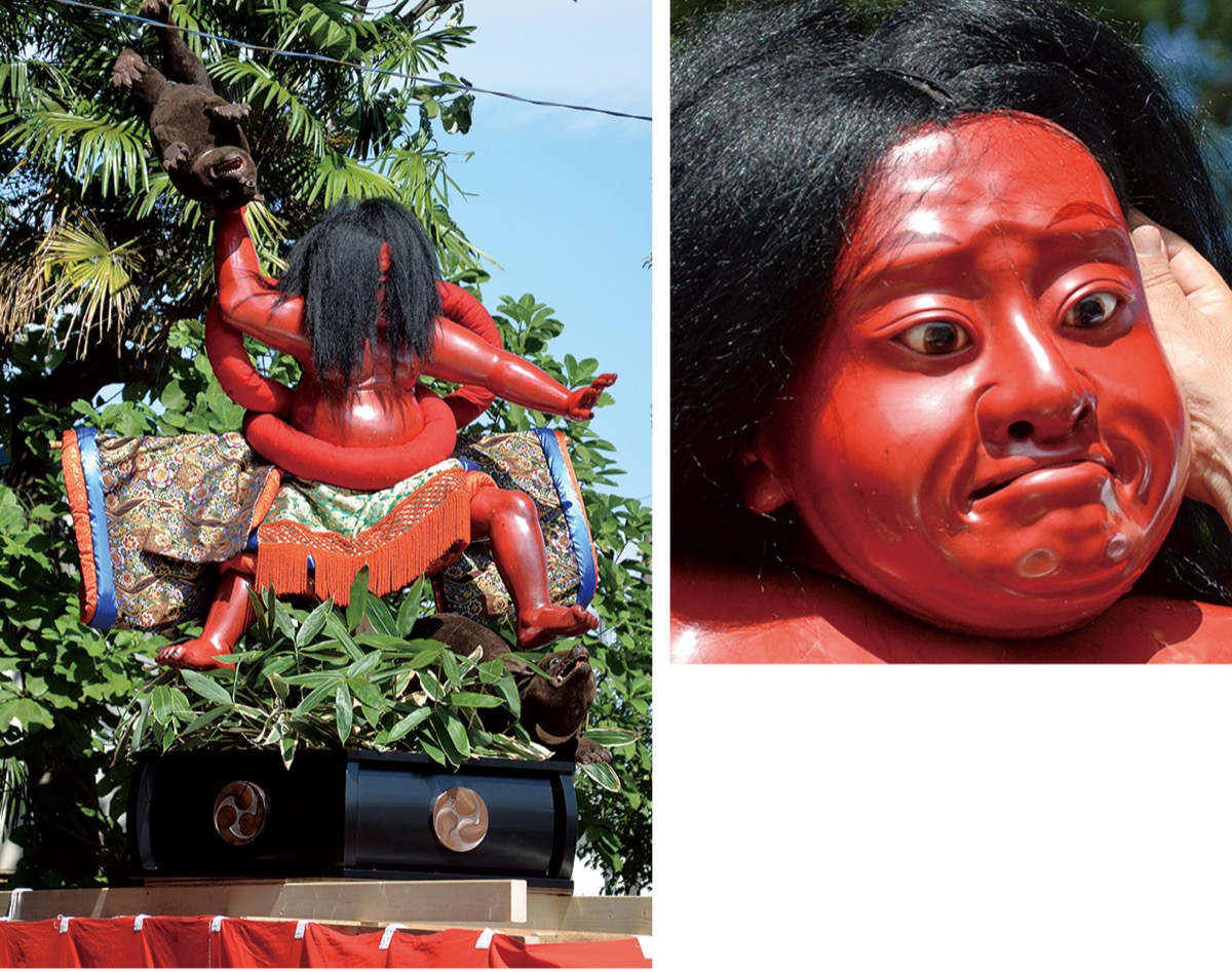 この金太郎は台座を含めて高さ2・2〜2・4mほど。1894(明治27)年に新調され、以来、地域の祭礼文化を伝える象徴として大切にされてきた。100年以上が経過していたこともあり、胴、足、腕、指などに剥落している部分が目立ち、頭髪はかつらが貼り付けられていた。岩座(台座)にも劣化があったため、祭りのできなかったコロナ禍に修復を決断。2023年の文化庁の地域文化財総合活用推進事業で修復が行われていた。
