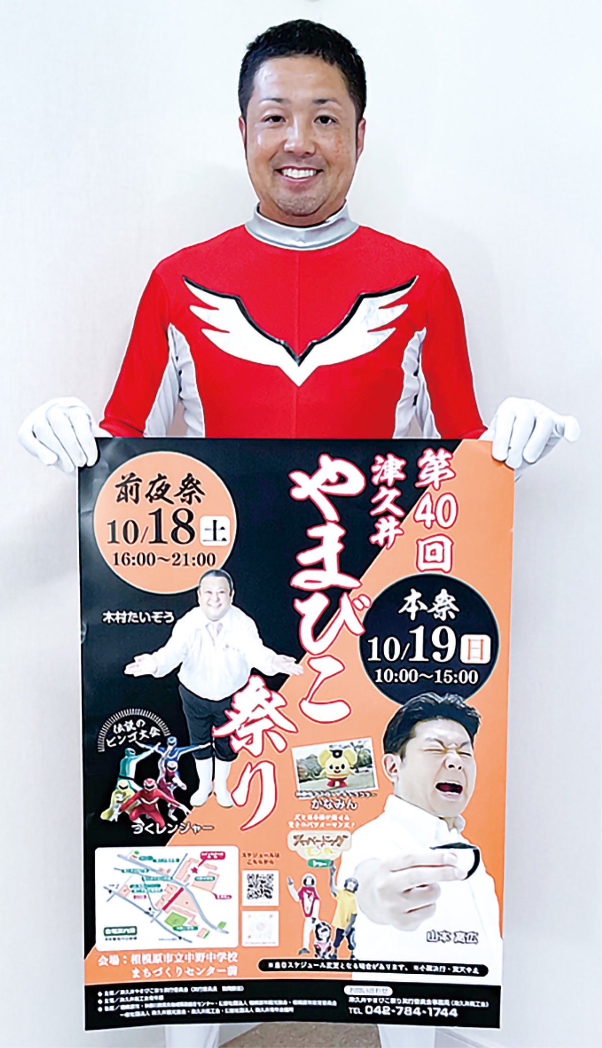 津久井のイベントに出没するヒーロー「つくレンジャー」のレッドでもある敦岡実行委員長。今年はキレキレのダンスを披露するためにメンバー全員がダンス教室に通い完成度を高めている。「練習の成果を楽しみにしてもらえれば」と笑顔を見せる。
