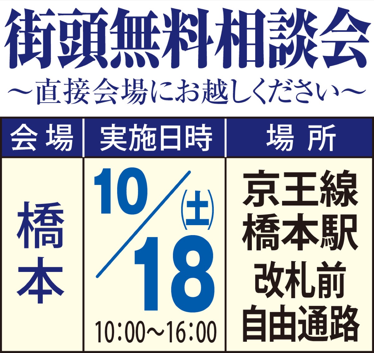 神奈川県行政書士会相模原支部(岡光栄支部長)は、市民向け無料街頭相談会を10月18日(土)、京王線橋本駅改札前自由通路で開催する。午前10時〜午後4時。予約不要。希望者は支部HPを確認の上、直接会場へ。