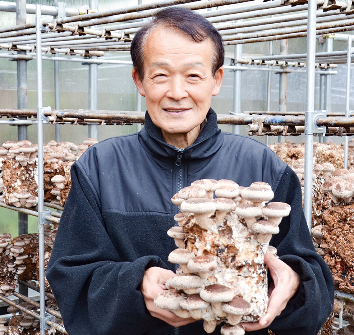 このハウスは広さ約100平方メートル。約1100個の菌床を設置して栽培する。1つの菌床から採れるシイタケの数は25〜30本で、最大で3万3000本のシイタケを採ることができる。さらに、菌床はシイタケを採った後も、3〜4回は使用できると言う。ハウスの完成直後に、準備しておいた菌床を設置。先週末には採れたてのシイタケを早速イベントで販売した。