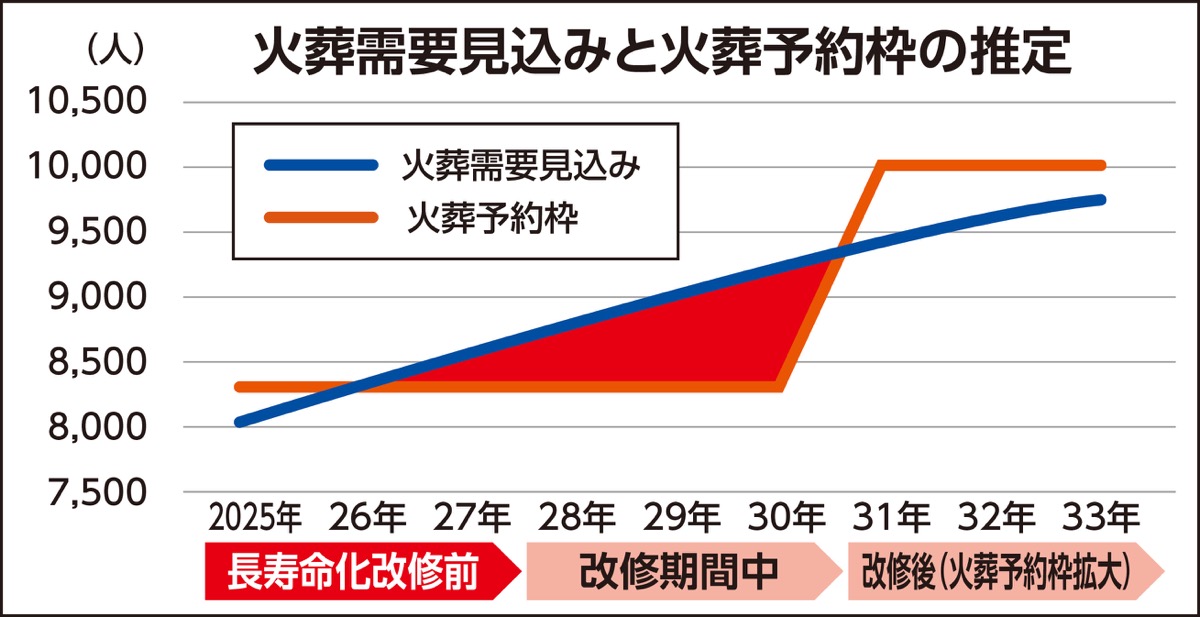市営斎場では火葬炉の長寿命化改修が28年度から30年度にかけて予定されており、期間中は火葬枠の確保がさらに難しくなることが懸念される。