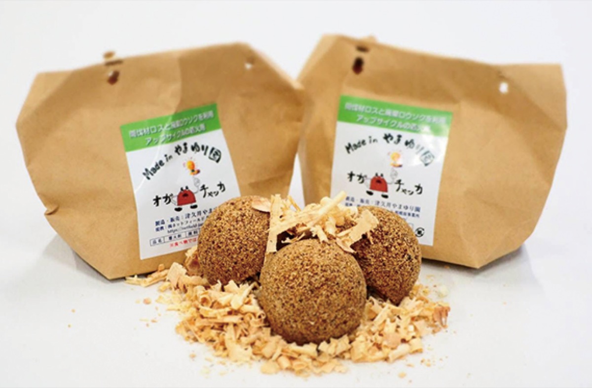 オガチャッカは、さがみはら津久井産材のおが屑と使用済みろうそくで作った着火剤。根小屋で自然素材を使った環境に優しい商品の製造、販売をする株式会社ネットフィールドが提携して商品を開発。材料の調達は同社が行い、製造と販売をやまゆり園が担う。園が製造、販売することで園にそのまま売り上げが入るしくみになっている。