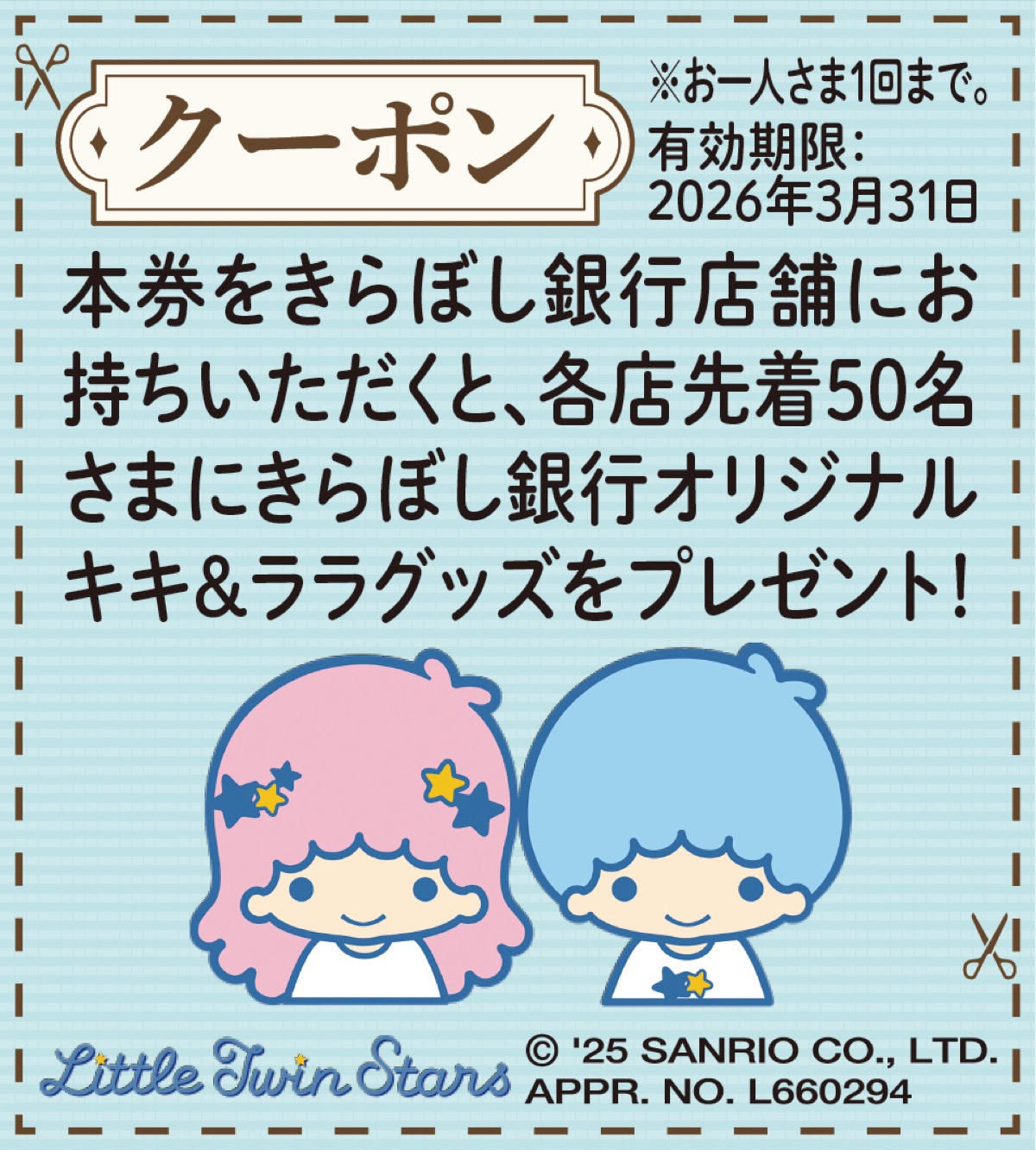 本紙クーポンをお近くのきらぼし銀行店舗へ持参すると、オリジナルキキ&ララグッズをプレゼント。「お気軽にご相談を」と担当者。