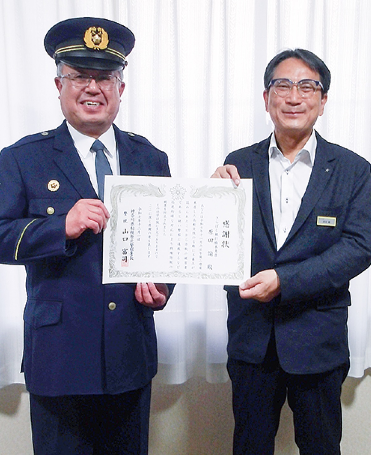 当日は同店で贈呈式が開催された。山口署長が被害防止について感謝を述べると、市野貴之支店長に感謝状を手渡した。