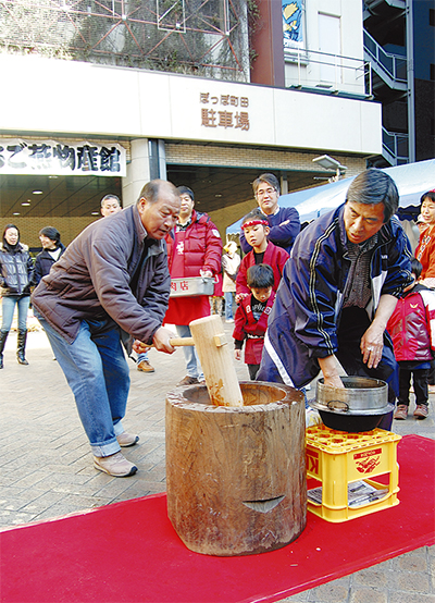 原町田四丁目商店会主催の餅つき大会が9日、まちの駅ぽっぽ町田広場で行われた。
