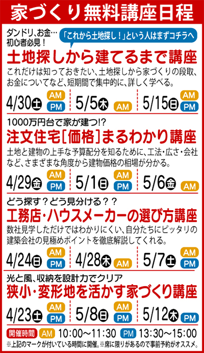建て売りか注文住宅か迷っている人も、この機会に一から、しっかり学ぶのもいいのでは。