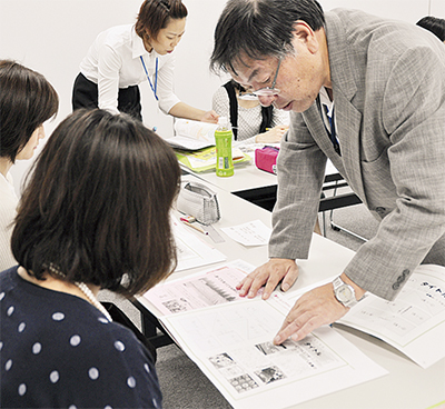 講習会では、割付用紙を使いながら読みやすいレイアウトやカラー印刷の種類など参加者からの質問に答えながら紹介した。