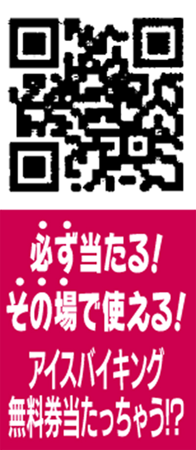 QRコード登録で、その場で使えるアイスバイキング半額又は無料券が当たっちゃう!さらに、アンケートに答えるとトッピング無料券や割引券が当たるかも。携帯会員限定のお得な情報も。よしかつへGO!