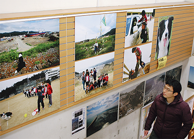 石川さんの写真集「THE DAYS AFTER〜東日本大震災の記憶〜」と「フリスビー犬、被災地をゆく〜東日本大震災、写真家と空飛ぶ犬、60日間の旅〜」の中の一部をパネル展示したもの。同店での石川さんのパネル展は昨年に続き2度目で、今回は石川さんの愛犬・十兵衛と触れ合うことで和んだ被災者の顔も見られ、被災地の様ざまな表情が映し出されている。