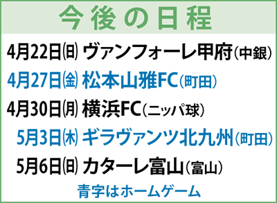 次節は4月22日(日)に山梨中銀スタジアムでヴァンフォーレ甲府と対戦(午後1時キックオフ)。