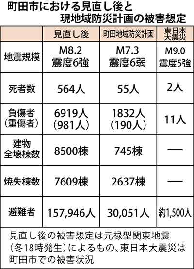 今回の見直しでは各区市町村の被害想定も報告され、町田市ではより甚大な被害をもたらすとする元禄型関東地震では、死者564人、負傷者6919人(うち重傷者981人)との被害想定が報告され、市が想定している死者55人の10倍増となった。また町田駅の帰宅困難者想定は約59000人(駅周辺4平方キロメートル圏)。