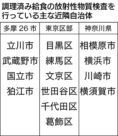 町田市は4月から、市内全公立小中学校の調理済み給食の放射性物質検査を開始した。夏休み前までの1学期中に全校で1回実施し、2、3学期にもう一度行い、合計年2回の検査を実施する。