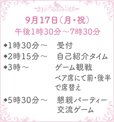 参加費は男性6000円、女性5500円。参加費には観戦チケット、パーティー・ゲーム費用が含まれている。募集は男女30人ずつで20歳〜45歳くらいまでの独身・社会人。