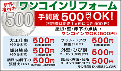 (株)翔工務店(南区双葉)では、ワンコインリフォームとして、家の簡単な修理を「500円!」で受付けている(材料費別途)。