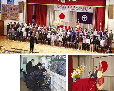 式典には、歴代の教職員や岡田英子教育委員長、渋谷友克教育長も駆け付けた。在校生代表として参加した6年生は、校歌ができる前、同校で愛唱された歌「みどりの風」を披露。卒業生の上村豊・周年行事副実行委員長が、地域の歴史を振り返り、この日参加した6年生に「卒業後も学校の節目には、地域や学校のことを子どもたちに話してあげて」と語りかけるなど、世代を超え学校を祝う機会となった。