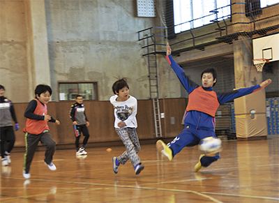 前半はパスやトラップなどを身体全体を使いながら練習。酒井良スクールコーチが指示すると、子どもたちは我先にとボールを追い、体育館を走り回り、笑顔が絶えない練習となった。