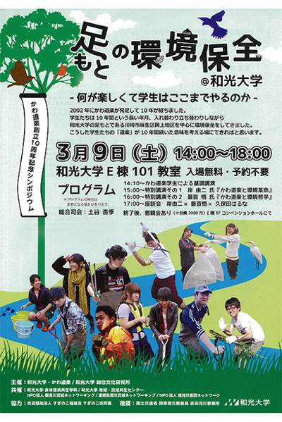 和光大学(金井町2160)の環境保全サークル『かわ道楽』が9日(土)、シンポジウム「足もとの環境保全@和光大学―何が楽しくて学生はここまでやるのか―」を開催する。午後2時〜6時、同大E棟101教室で。入場無料、予約不要。