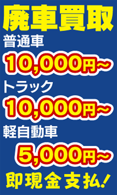 3月中に車を処分しそびれた方に朗報。4月1日以降でもMGBなら自動車税を負担してくれるので(4月いっぱい)、諸費用ゼロで処分ができる。それどころか、どんな車でも普通車・トラックは10000円〜、軽自動車は5000円〜で買い取ってくれる。