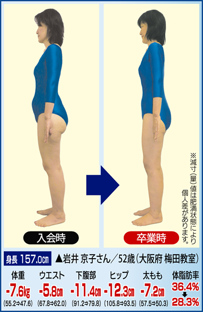 今まで一番おとしたかった腰まわりや太もものサイズダウンができなかった岩井さん。プロポーション・アカデミーに通っていた知人が独自開発のマシンで20kgやせ、腕がほっそりしたと聞いて訪れました。「始めはマシンだけで脂肪が燃焼できるのか不安だったけど、期待以上にヒップのぜい肉を落とせました」と話す岩井さんは、ヒップ12・3cm減、太もも7・2cm現を実現。「ピンポイントにやせたい部位をサイズダウンできるのがいい!脚の間に隙間ができるなんて」と喜びの声をあげています。