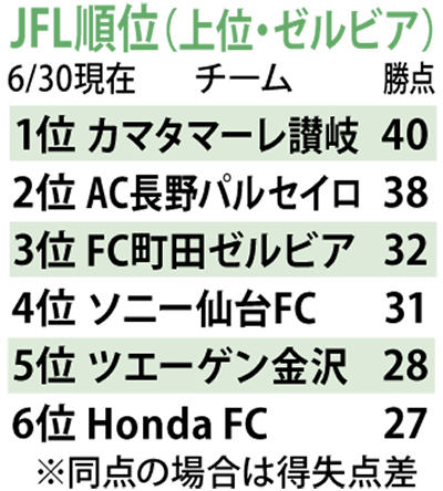 首位カマタマーレ讃岐は勝点40に、2位のAC長野パルセイロは同38となり、ゼルビアにとっては、これ以上引き離されたくない状況が続いている。