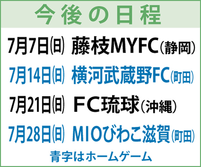 次節は7月7日(日)に藤枝MYFCと対戦(静岡)。次回ホーム戦は7月14日(日)、横河武蔵野FCと対戦。午後3時キックオフ。