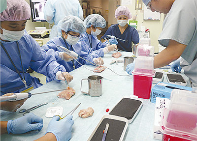 当日はグループごとに手術室、薬剤科、リハビリ科を見学し、腹腔鏡体験や鶏肉を使った電気・超音波メス・縫合体験のほか、調剤体験、車イス体験、パラフィン浴体験、病院食体験など医療の現場を体験した。