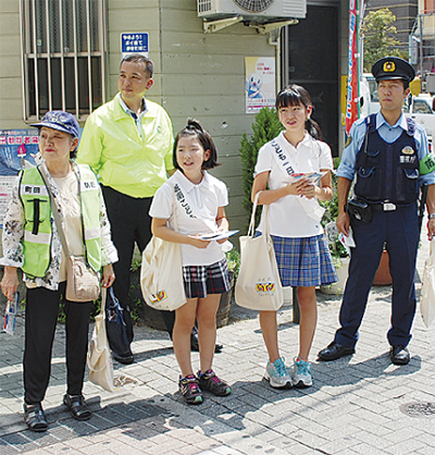 この日は同金庫が推進している社会貢献事業のひとつ「城南こども1日支店長体験」が行われており、こども店長に選ばれた松田望さん(藤の台小6年)と愛美さん(同小4年)の姉妹が、道行く人々に振り込め詐欺撲滅を訴えるチラシとティッシュ配りを行った。
