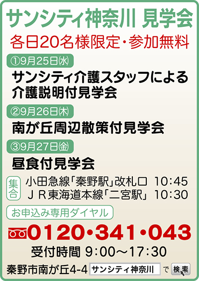 富士山と、丹沢の雄大な景色を望む秦野市に位置する介護付有料老人ホーム「サンシティ神奈川」は9月25日(水)から27日(金)まで、見学会を開催する。初日の25日は、介護スタッフによるサンシティ神奈川の介護についての説明付見学会。26日は隣接する広大な自然林など周辺散策付きの見学会を予定。秦野駅からシャトルバスで7分。徒歩圏内にスーパーや公民館、郵便局なども点在する便利な環境に位置するサンシティ神奈川。介護保険法による人員配置基準「3:1」以上の「1・5:1」の手厚い介護体制のほか、医療面での充実したサポート、洗練されたホスピタリティでも人気を集めている。温水プールや毎日予約なしで利用できるレストランなどの充実した共用空間を用意。一方、居室は床暖房や無段差設計など、安心して毎日を過ごせる設備を備えている。看護師と介護スタッフが24時間常駐するほか、クリニックも併設。また自宅を残して入居して生活に慣れたい、将来介護が必要になった時のために事前に契約したい人向けに別荘扱いの制度や、身元引受人(兼連帯保証人)を立てられない人のための保証金制度など、安心して入居できる制度も充実。27日は館内のレストランで入居者と同様に旬の味を満喫する3種類のメニューから選べる美味しい昼食付き。申込みは左記まで。