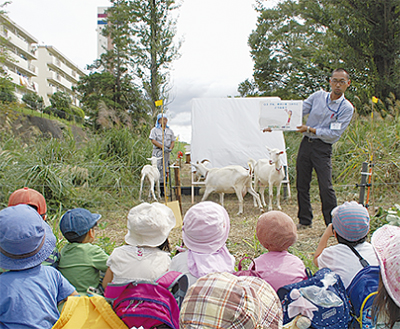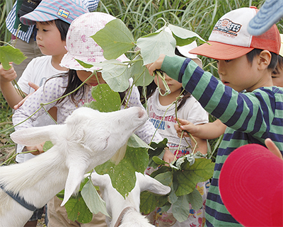 26日には近くにある「ぱんだ幼稚園」の園児や保護者が招待され、ヤギ4頭との触れ合いを楽しんだ。園長の藤田直美さんは「子どもたちがヤギの世話を楽しみながら、大きい子が小さい子を気遣うなど、動物との触れ合いを通じて学べるいい機会でした」と話した。