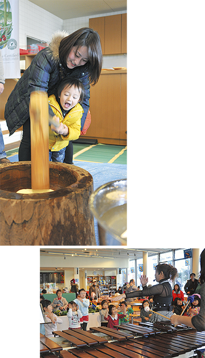 当日はもちつき大会や子ども映画上映会、おはなし会などが企画され、餅つきには長蛇の列ができ、子どもたちは大きな掛け声とともに杵を思いっきり振り下ろした。用意した30kgのもち米が20回ほどに分けて、一臼出来上がるたびに拍手が起こっていた。