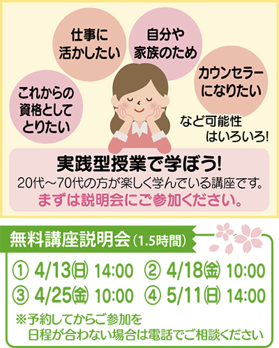全国26教室でカウンセラーを養成する「敬愛カウンセラー学院」の町田教室で4月13日から、春の無料講座説明会が開かれる。
