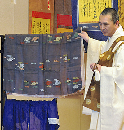 また今回の披露大題目では、数十年振りに祖師像が身に着けていたと言われる袈裟と法衣が披露された。袈裟は七条袈裟という大きな法要などで身に着けるもので、夏用とみられる。また法衣は上下に分かれた下半身にまとうもの。「保存してあった状態を考えると昭和40年代のものと思える。初めて見た人も多いだろう」と武相講の人たちは話す。