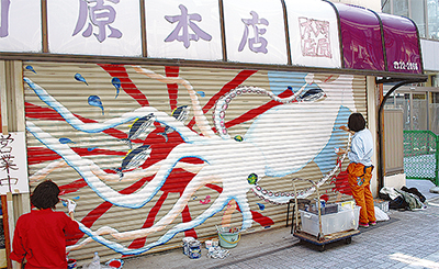 河原商店のシャッターには躍動感あふれるダイオウイカの製作が始まっている。店主・河原一慶さんは4月から、知り合いの市内絵画教室「アトリエ一番坂」(舘岡豊照代表)と協力してシャッターにアートを描く活動を開始した。生徒と一緒に取り組んでいる絵は街行く人から「ダイナミックな絵で街が明るくなっていい」と評判だ。町内会でも同様に原町田4丁目第一町内会館で「獅子舞」や「七福神」、「祭り」などをテーマに「アートによる街づくり」が行われている。しかし、この活動は「落書き」に対抗する手段だった。