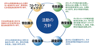 想定される事業活動は、企画展示、常設展示に加え、多目的に使える「フレキシブルスペース」を設け、様ざまな規模の展示を可能にすることで、新鮮で変化に富んだ展示ができるようになる。また市立博物館が収集してきたボヘミアンガラスや東南アジアの陶磁器といった所蔵作品に関わりが深い作品を中心に、工芸美術を購入していく。