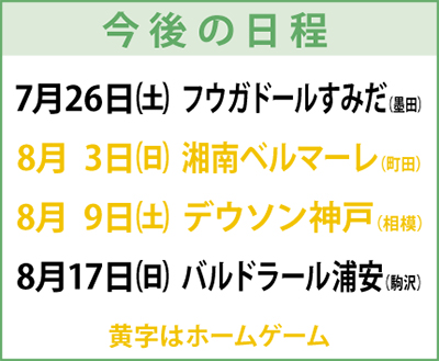 追加点を決めた滝田選手は「一言で言うなら本当に嬉しいです。今は自分たちのクオリティを高めている段階。一貫して出ている課題や新たな課題もありますがチームとしては確実に良くなっていると思います。自信を持って次節に臨みたい」とコメントした。関野淳太監督は「大阪戦での敗戦から選手がしっかり気持ちを切り替え、努力をしてくれた。来週もいい準備をして、繋げたい」と次を見据えた。次節は7月26日(土)、フウガドールすみだとのアウェー戦。次のホームゲームは8月3日(日)の湘南ベルマーレ戦。