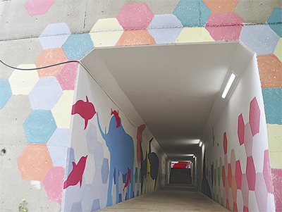 全長約40mの地下道には明るくカラフルな色調の中にゾウやキリン、クジラなど様ざまな動物たちが成長する様子が描かれた。