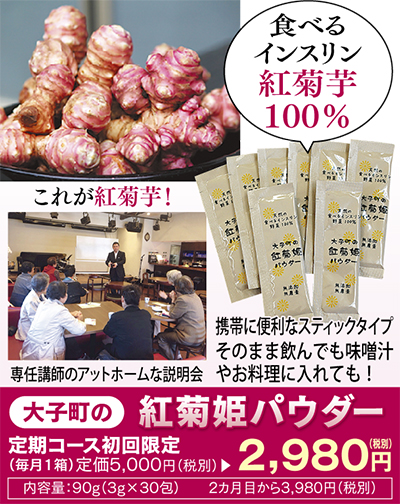 今回紹介する「紅菊姫」は、めずらしいフランス種紅菊芋100%。血糖値の上昇を抑制する効果のあるイヌリンによる「糖の吸収抑制、血流改善」、善玉菌を増やす「整腸作用、便秘改善」に効果が期待できるという。紅菊姫は茨城大学農学部(白岩教授チーム)の学会発表商品で産経新聞社が厳選商品だけを販売する「産經逸品堂」に選ばれたお墨付き商品。産地はこだわり野菜で有名な茨城県大子町の奥久慈農園。