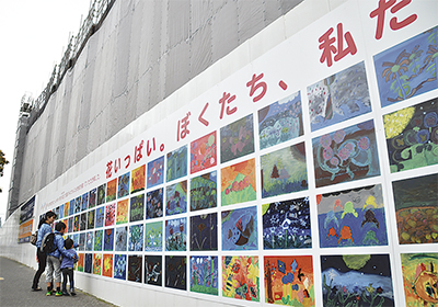 多摩境駅から徒歩3分の好立地に2016年初めに完成予定のマンション『シャリエ多摩境』では、無機質になりがちな工事中の防護壁を子どもたちの絵でいっぱいにしようと企画。相談を受けたアレサ商栄会は、「面白そう、すぐにやろう」と協力を申し出た。警察や小学校など関連機関とすぐに打ち合わせを行い、現在149枚の小山中央小学校の当時3年生の絵が飾られている。「地域貢献をしたいと考えていました。地元の方々に大変協力していただいたので、予想以上の壁画アートになりました。それにしても、皆さんがすぐに行動してくれたのはビックリしました」と同マンション。壁面には絵だけでなく警察署の標語「『母さん助けて詐欺』から家族を守ろう!」なども書かれている。「この地域には高齢者も多いので、被害も減っていない。警察からのアピールだけなく、このような目立つ場所に掲げてもらい、とてもありがたい」と南大沢警察署。