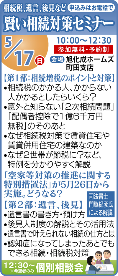 セミナーでは相続増税のポイントなどをやさしく解説するほか「認知症になってしまったあとでもできる相続対策」など、遺言や後見についても分かりやすく説明。また相続対策や「私的年金」としても検討したい「賃貸併用住宅」も紹介する。参加は気軽に。