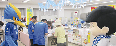 「地域でゼルビアを応援しよう」と、市内の城南信用金庫4店舗で応援イベントを開催している。先月29日には本町田支店にゼルビアのゼルビーくんが訪れ、同金庫のしんちゃんと対峙(写真)。当日はスタッフもユニフォームで顧客対応した。「地元企業として地元チームを応援して盛り上げたい」と宮原淳支店長。