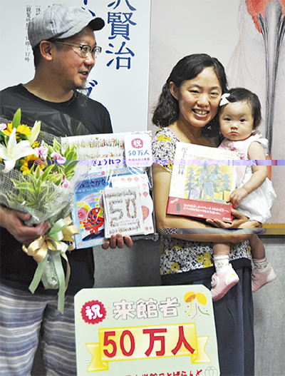 記念すべき50万人目の来館者となったのは、家族で同館に訪れた本町田在住の池原しずくちゃん(1歳)。母親の実歩さんは同館オープン時から利用している”文学少女”。しずくちゃんが生まれてからも展示会やお話会ごとに来館しているという。「開館当時から知っているので、50万人も足を運んだなんて感慨深いです」と感想を述べた。
